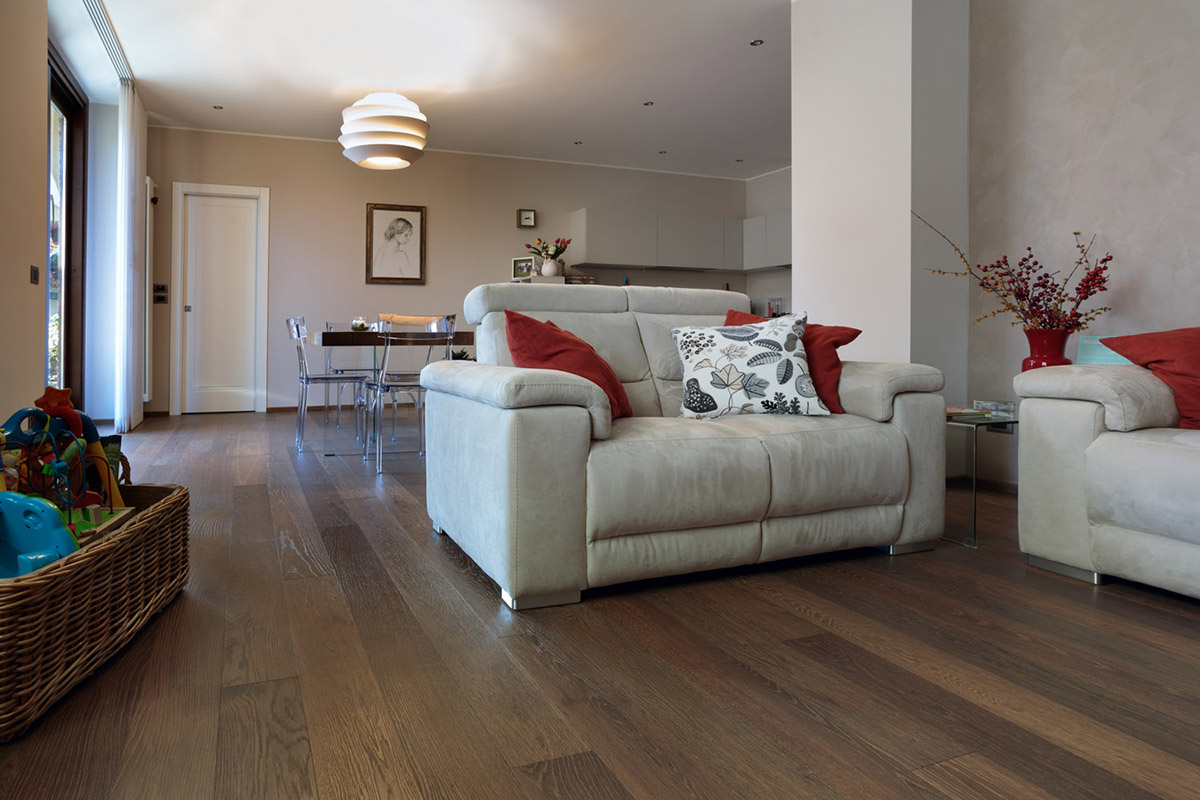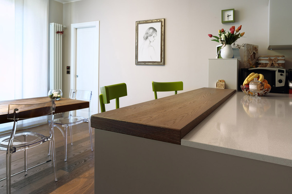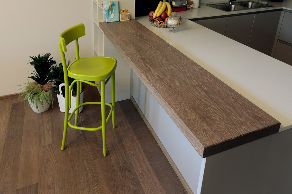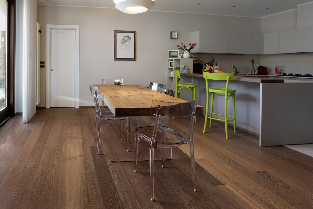 L'arredamento moderno e con alcuni pezzi di Design risulta perfettamente integrato con il Rovere Terraccesa, dalla collezione Luci di Fiemme, utilizzato anche per la realizzazione del piano cucina, le cui tonalità variegate e le sfumature morbide richiamano i colori del caramello.