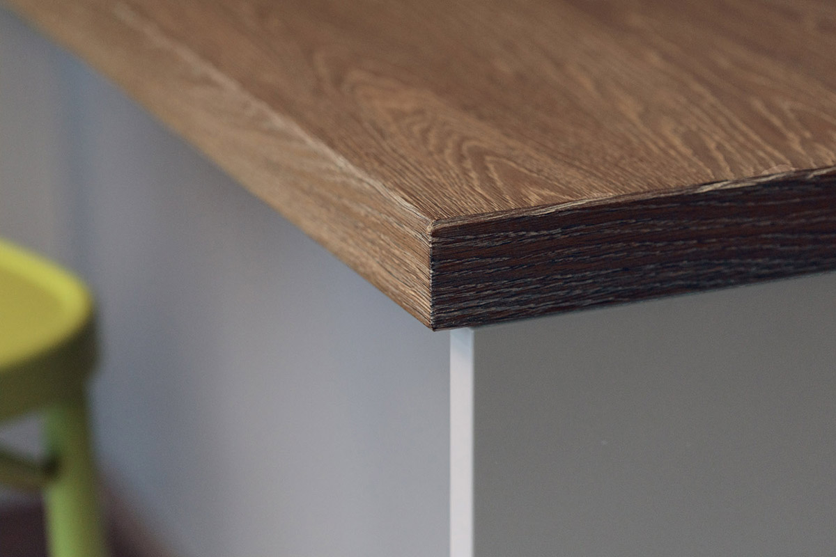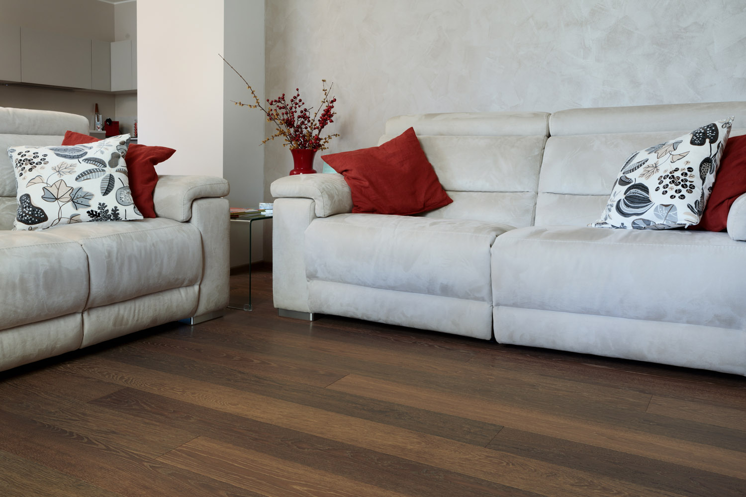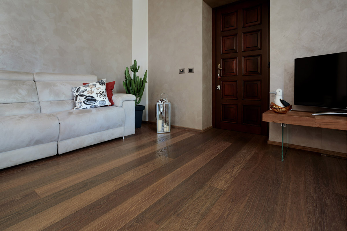 L'arredamento moderno e con alcuni pezzi di Design risulta perfettamente integrato con il Rovere Terraccesa, dalla collezione Luci di Fiemme, utilizzato anche per la realizzazione del piano cucina, le cui tonalità variegate e le sfumature morbide richiamano i colori del caramello.