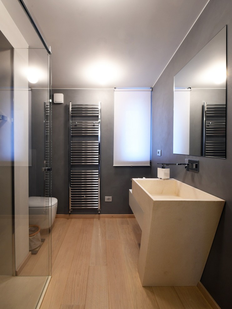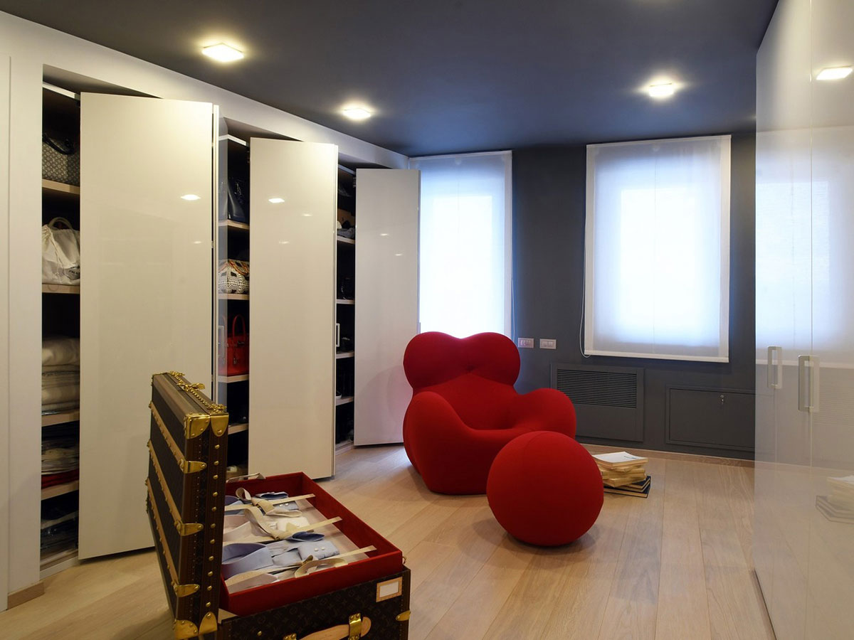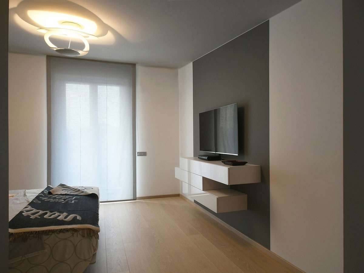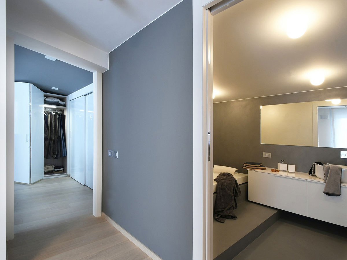 Per il pavimento è stato scelto un Rovere senza nodi, la cui sbiancatura lo rende uniforme e compatto; le porte richiamano fortemente alla modernità grazie alla finitura bianca lucida al Polyestere.
